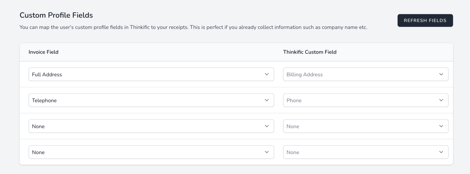For each custom field in Thinkific (Right hand column) you can map it to the field on the invoice (Left hand column). If you wish for a field to be ignored or not included, select None. A field will only appear on the invoice if it has a value i.e. Empty fields will not appear on the invoice.