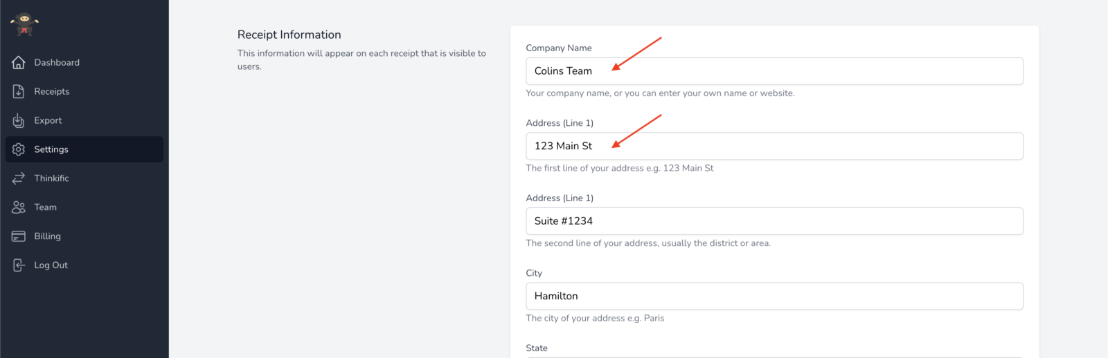 3. Enter your details in the respective input fields e.g. Company Name, Address, Tax Number etc. These will appear exactly as you enter them on all invoices.