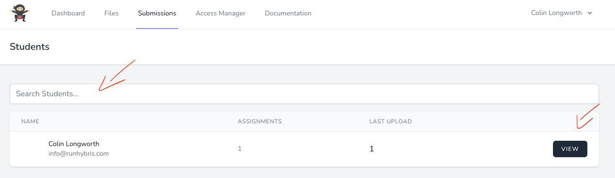 2. Click Submissions on the top menu bar, or navigate to https://files.wooninja.io/assignments/users The students that have accessed the file share will be displayed, along with their submission count. Students that have not accessed the file share, or have not made submissions, will not be displayed. You can search for students by name and email in the given search bar. To view a student’s submissions, click View