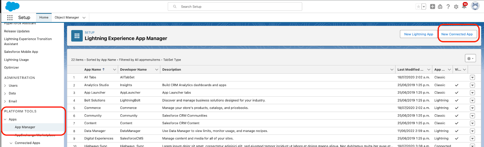 - Click Platform Tools, then App Manager, followed by New Connected App