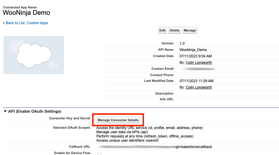 The callback URL is the address of your WooNinja SSO application, followed by /login/salesforce/callback E.g. https://connect.wooninja.io/login/salesforce/callback