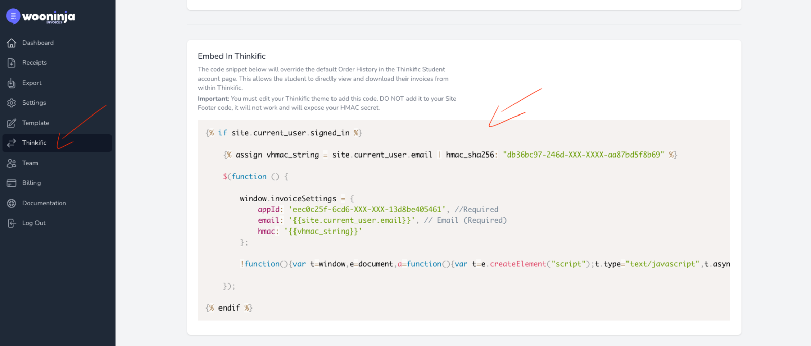 - Open WooNinja Invoices, and click Thinkific. Scroll down and copy your unique Embed Code: