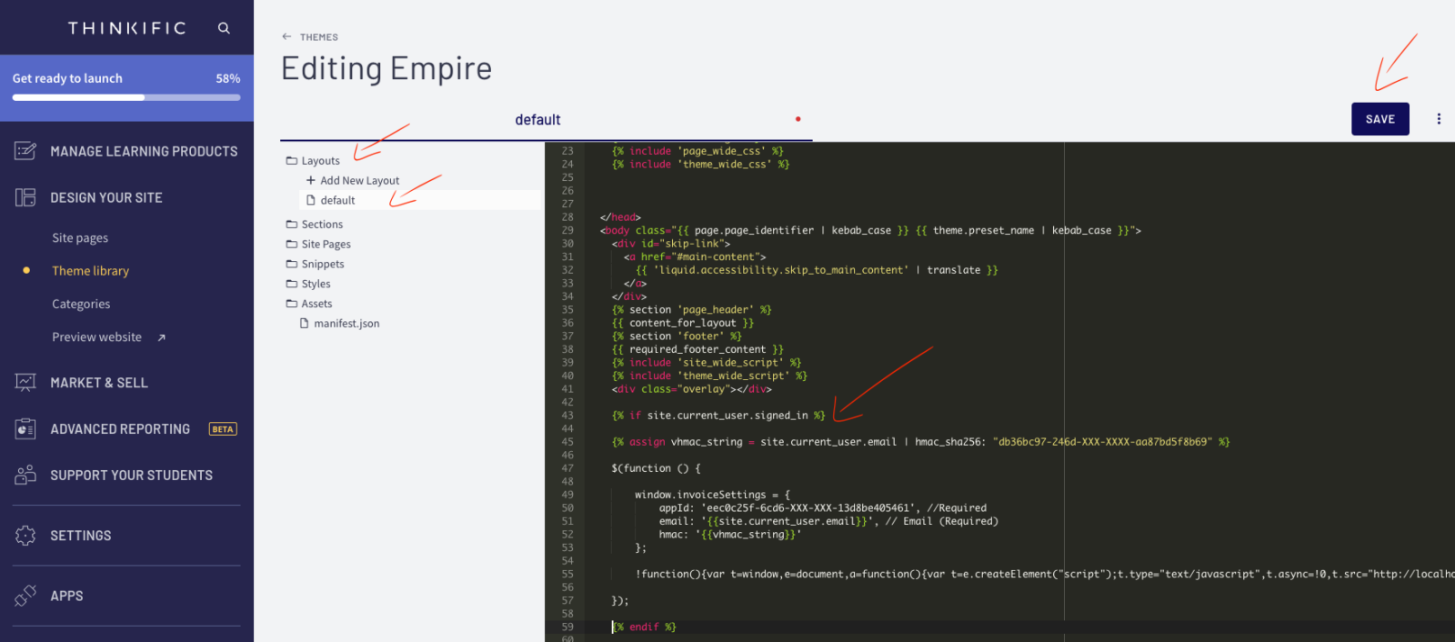 2. Open your Thinkific School, click Design your Site, then Theme Library. Click the three vertical ‘dots’, and then Edit Code