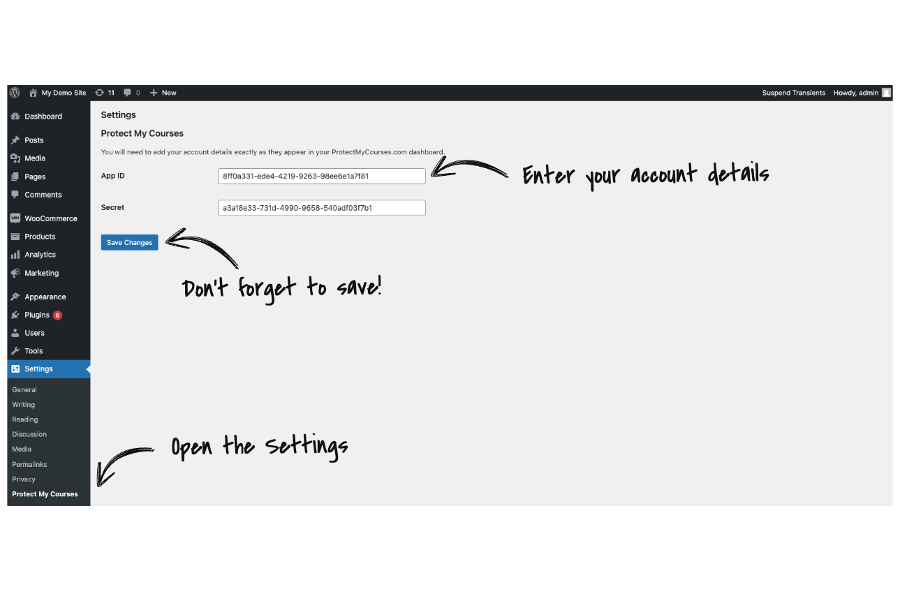 3. In WordPress, open Settings, then Protect My Courses. Enter your App ID and Secret, and click Save Changes