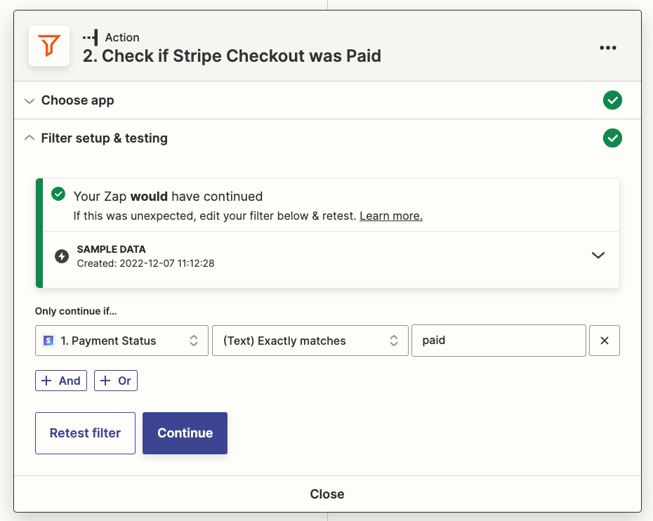 2. Add an action, Filter by Zapier, that checks if the payment status from Stripe is paid. This is required as if the payment fails, or the user abandons the cart, the Zap may still trigger.