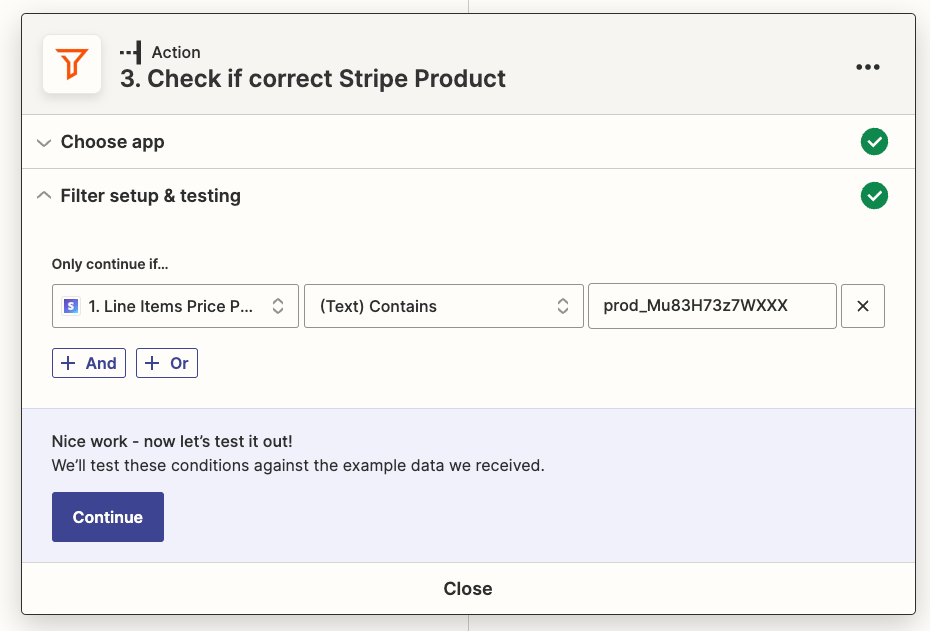 3. Add an action, Filter by Zapier, to confirm the line item is the product you created in Stripe.