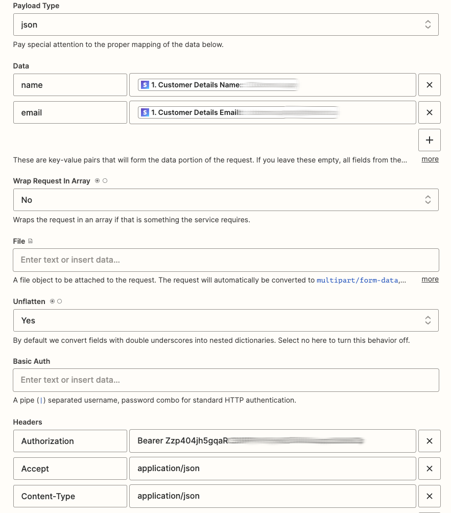 - In the data field, enter the name as the Customer Details Name (From the Stripe Step) and email as Customer Details Email (From the Stripe Step)