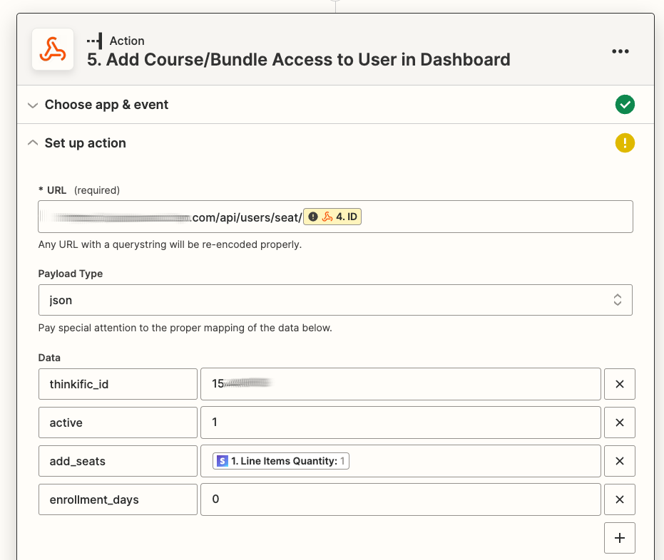 - For data, enter action as 1, add_seats as the line item quantity from the Stripe step, and the enrolment_days based on your sales e.g. 365 for 1 year, 0 for no expiry etc. Finally, enter thinkific_id as the Thinkific Product ID (Do not use the “Productable” ID)