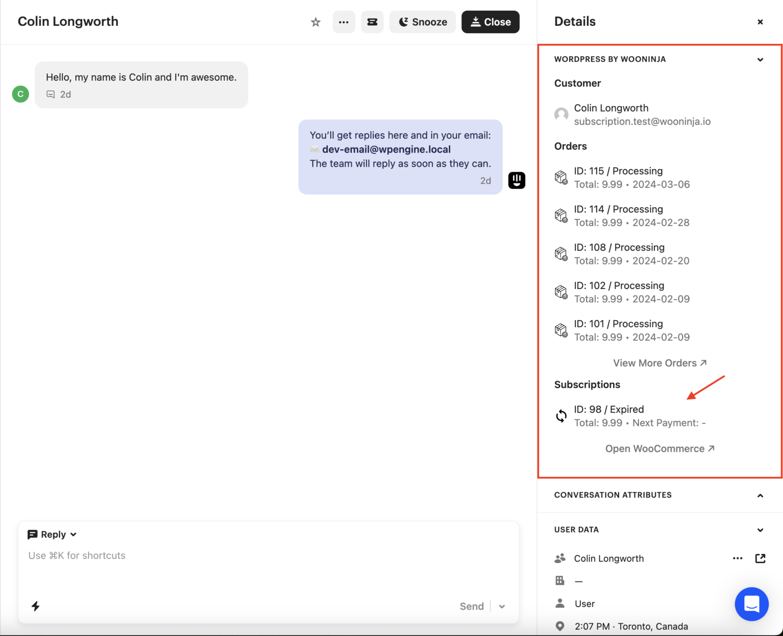 When a customer messages you in Intercom, our plugin instantly displays their current order details. This eliminates the need for your team to open WooCommerce in a separate tab. Enjoy real-time order updates, including subscription details, and streamline your workflow by keeping everything in one place.